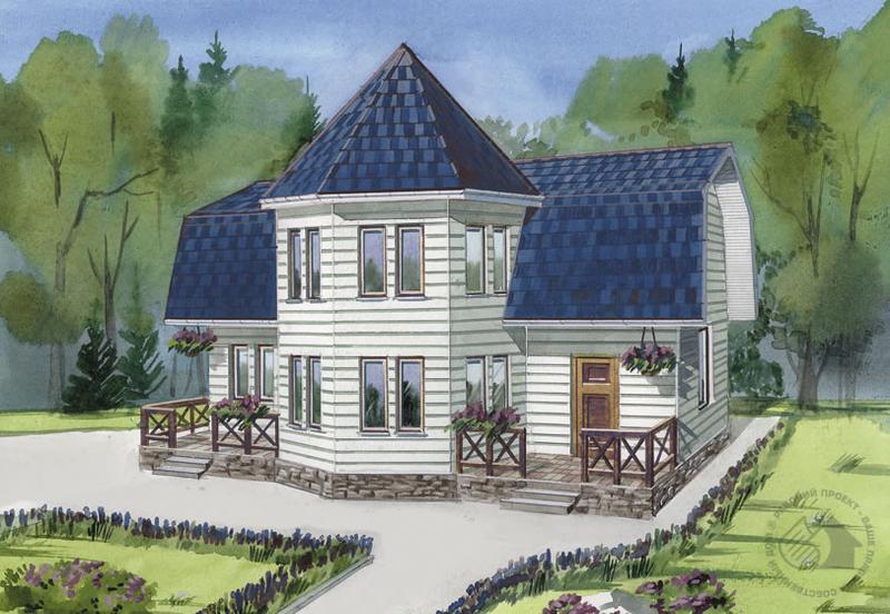 Красивый, современный коттедж с удобной планировкой. Определяющим архитектурным решением в облике здания является четырехгранный эркер с шатровой кровлей. В этом эркере на первом этаже располагается просторный светлый холл с выходом в другие помещения, в числе которых кухня, гостиная, подсобное помещение. Пространство гостиной и холла можно объединить, увеличив проемы в разделяющей их перегородке. В холле находится открытая деревянная лестница на второй этаж. Второй этаж эркера также занят холлом. Сюда выходят четыре спальные комнаты. А сам холл может одновременно служить второй гостиной. Вход в дом организован непосредственно в холл эркера. Если строительство предполагается в холодном климатическом регионе, имеет смысл сделать дополнительный тамбур. В доме нет встроенного гаража, он предполагается отдельно стоящим.