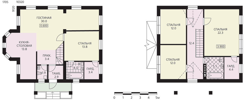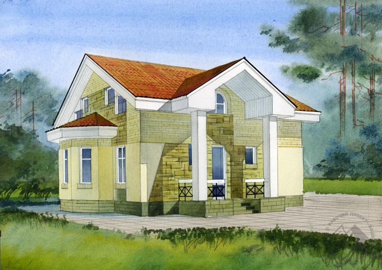 Этот симпатичный коттедж с эркером имеет рациональную планировку, позволяющую максимально полно использовать внутреннее пространство дома, что делает его достаточно экономичным и доступным жильем. А красиво декорированные фасады еще более увеличивают его привлекательность. В планировке первого этажа совмещены две зоны: гостевая и спальная. Гостевая зона решена по принципу свободной планировки, где прихожая, гостиная и кухня-столовая образуют единое пространство. Пятигранный эркер кухни-столовой не только обогащает это пространство, но и формирует облик дома снаружи. Спальная зона первого этажа представлена спальней, совмещенной с ванной и гардеробной. В мансарде расположены три спальни и ванная комната. Вытянутый центральный холл благодаря освещению с двух противоположных сторон не кажется узким коридором, а воспринимается как полноценный лестничный холл.