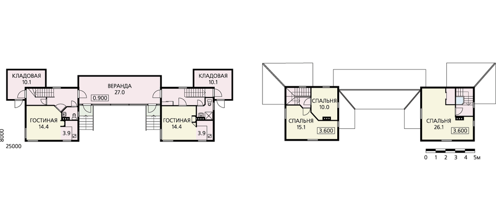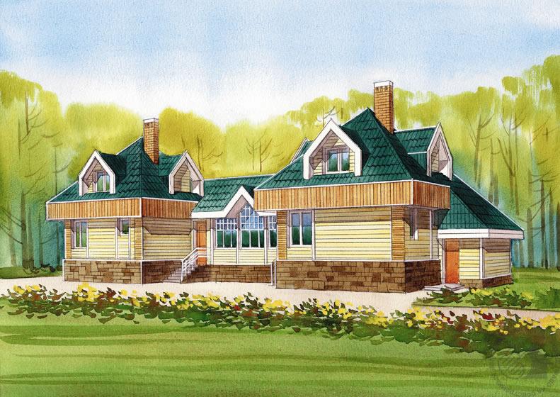 Интересный и необычный вариант блокировки, два симметрично расположенных дачных дома сблокированы через летнюю веранду-гостиную. Постройка может служить дачей для двух семей или использоваться при создании баз отдыха и кемпингов. Каждый из домиков представляет собой мансардную постройку общей площадью 51.2 м2. Внутренние планировки – вариативны, можно остановиться на одном, а можно использовать и оба предложенных варианта, как показано на планах. На первом этаже – гостиные с небольшим альковом для кухни и санитарный блок. Мансарды решены по-разному. В одном случае это большая спальня с гардеробной, в другом – две спальные комнаты. Вход в каждый из домиков – через общую веранду, которую можно разделить перегородкой, изолировав дома друг от друга. К каждому из домов пристроена небольшая кладовая, через нее также можно попасть в дом.