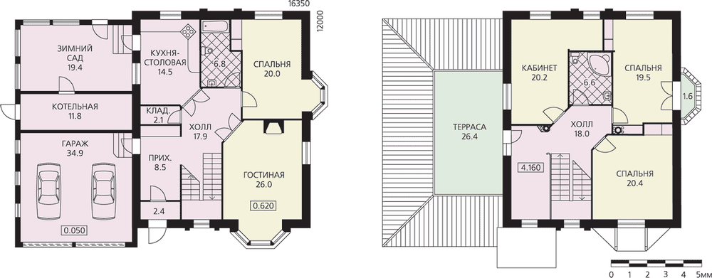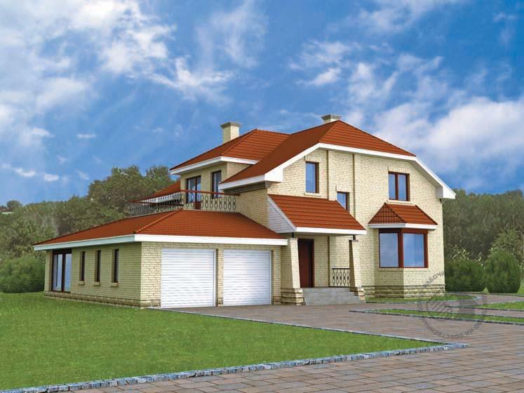 Достаточно традиционный по внешнему виду дом имеет необычное планировочное, объемное и конструктивное решение. Жилая часть дома сблокирована с пристройкой, где размещаются гараж, зимний сад и котельная. Пристройку можно возводить во вторую очередь. Техническая зона с гаражом отделена буфером в виде котельной от зимнего сада. Зимний сад остеклен, он связан с кухней и имеет выход на улицу. Конструктивное решение, предложенное в проекте, позволяет избавиться от внутренних несущих стен и, соответственно сделать планировку дома гибкой. Несущие стены заменены на 2 стальные стойки, служащие опорой для стальных балок и плит перекрытия. Подвал отсутствует, на первом этаже жилого дома расположены гостиная, кухня, спальня и ванная комната, в мансарде – еще три спальни. На крыше гаражной пристройки организована большая открытая терраса, куда можно выйти из холла мансарды.