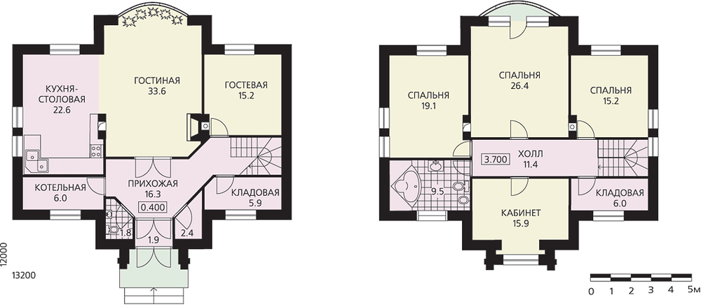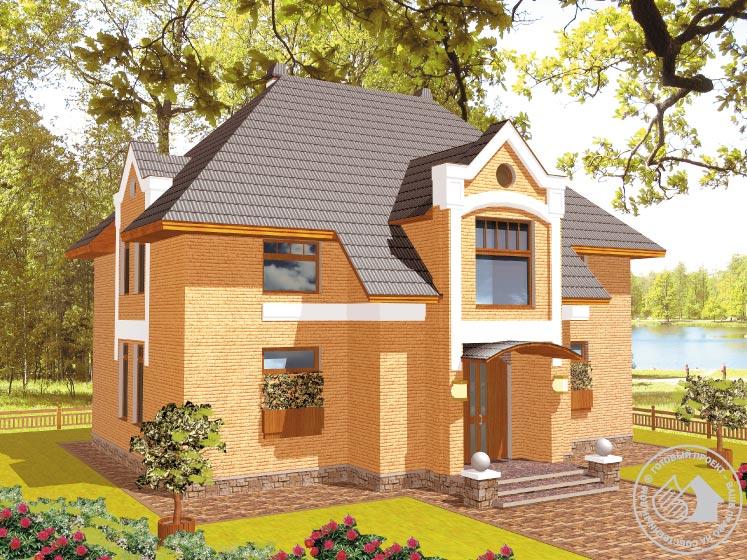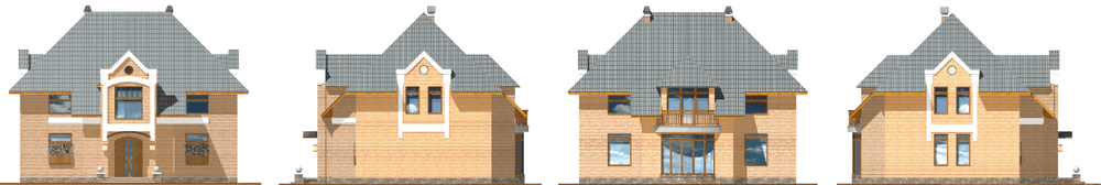Солидный особняк с симметрично решенными фасадами и планировкой. Использование симметрии в решении придает этому дому основательность и монументальность. Это жилье для солидных людей, не терпящих суеты, но ценящих комфорт и стабильность. Вход в дом оформлен массивным ризалитом, подчеркивающим эту основательность. В доме два этажа, подвал отсутствует, чердак не эксплуатируется. Входная зона первого этажа оформлена порталом с декоративным фронтоном. Внутренняя планировка под стать внешнему облику – респектабельна и основательна. Центром планировки первого этажа является гостиная с эркером и красивым полукруглым витражом. Смежно с ней расположена кухня-столовая, через перегородку – гостевая. На втором этаже – три спальни, кабинет и ванная комната. Мероприятия по утеплению и освещению чердака позволят оборудовать здесь дополнительные жилые помещения.