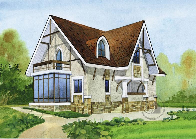 Очень красивый, изящный особняк, в стилистике которого прослеживаются элементы старых добрых традиций. Это дом со свом лицом, с очень индивидуальным, характерным обликом. Его создают и массивные контрфорсы по углам дома, и кронштейны, и элементы фахверка фасадов, и форма окон. Такой дом не хочется втискивать в плотную застройку, ему нужен простор и возможность обзора со всех сторон. Проектом предусмотрены два этажа, на которых размещены семь жилых комнат, не считая кухни-столовой. Такое количество помещений позволит разместиться многочисленной семье и принимать гостей. Подвал отсутствует, чердак не эксплуатируется. На первом этаже центральное место отведено гостиной. По одну строну от нее расположена кухня-столовая с выходом в зимний сад, по другую – спальня. Еще одна жилая комната, выполняющая роль кабинета, расположена при входе в дом. В мансарде на три спальни приходится две ванные комнаты и достаточно просторная кладовая.
