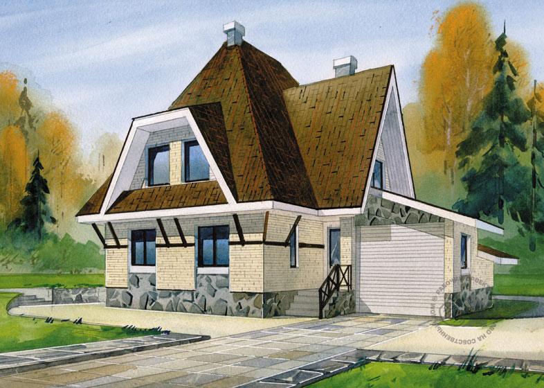 Небольшой дом-шале с высокой кровлей особенно гармонично впишется в живописный лесной массив. Большие плоскости скатов кровли потребуют особо тщательного отношения к подбору кровельного покрытия, оно должно быть красивым и качественным. Высокая кровля скрывает большое чердачное пространство. По проекту оно не эксплуатируется. Проектом также не предусмотрен подвал, дом покоится на монолитной плите, что позволит возводить его на сложных грунтах. В распоряжении владельцев дома два жилых этажа. На первом расположены гостевые помещения и небольшой кабинет. Гостиная состоит из двух частей: собственно гостиной с лестницей и каминной. В одном объеме с ней находится кухня-столовая. Гараж – пристроен к дому. Гостевая тема нашла свое отражение и на втором этаже в виде небольшой гостиной-холла. При желании на ее месте можно оборудовать дополнительную спальню, помимо трех, уже расположенных в мансарде.