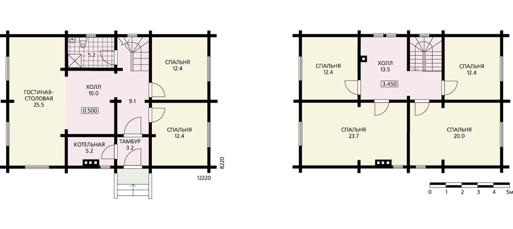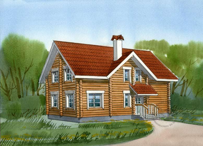 Традиционный бревенчатый дом. Его традиционность проявляется и во внешнем облике, и в традиционной для загородного домостроения планировке. План представляет собой строгий прямоугольник. Подвал в доме отсутствует, эксплуатация чердака не предусмотрена. Все помещения размещены на одном этаже и мансарде. Первый этаж функционально можно разделить на две части. По одну сторону от прихожей расположены гостевые помещения, по другую – спальни. К первым относится гостиная, кухня-столовая и гостевой холл. В гостиной возможна установка камина, фундамент к которому выполняется по месту. Рядом со входом в дом находится котельная, санузел приближен к спальням. В мансарде расположены еще четыре спальни. Отсутствие ванной – существенный, но вполне исправимый недостаток планировки этого этажа. Ванную комнату можно разместить в холле, рядом с лестницей непосредственно над санузлом первого этажа.
