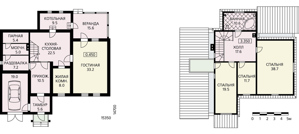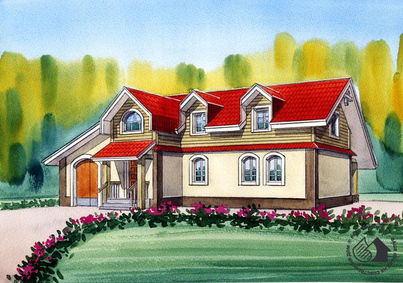 Мансардный дом из комбинированных материалов. Первый этаж в проекте решен из газобетона, мансардный - из деревянного каркаса. Ни подвала, ни чердака не предусмотрено, все пространство дома используется максимально полно. Планировка достаточно традиционна, и в тоже время своеобразна. На первом этаже все помещения группируются вокруг кухни, которая одновременно служит холлом и из которой лестница ведет на чердак. К недостаткам данного решения можно отнести отсутствие дневного света в кухне. Исправить этот недостаток можно методом перепланировки, например, передвинув в сторону котельную, что, конечно, потребует вмешательства архитектора. Планировка этого этажа также включает в себя гостиную, небольшую жилую комнату, гараж, зону релаксации уже упомянутые кухню и котельную. Мансарда представлена тремя спальнями и ванной комнатой. Их объединяет, расположенный в центре плана, небольшой лестничный холл.