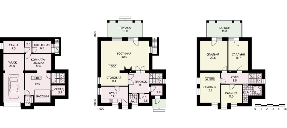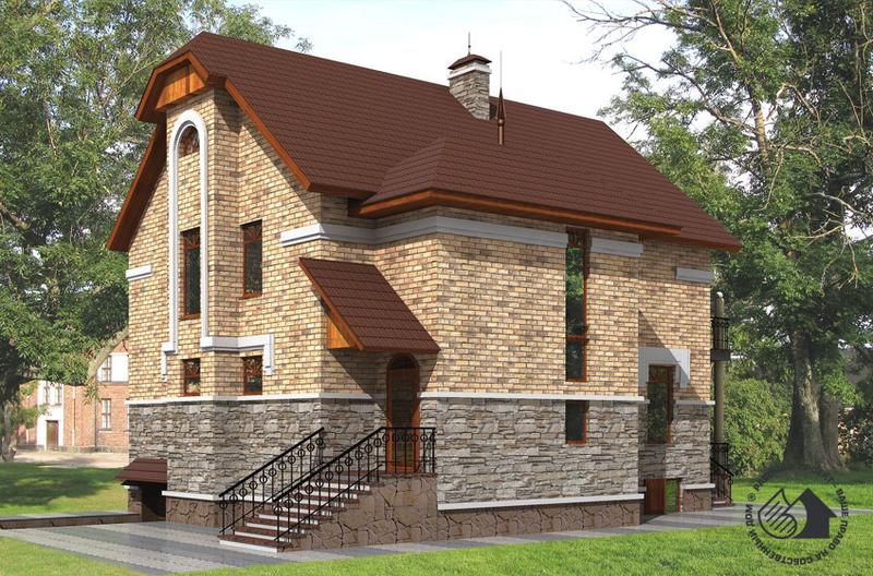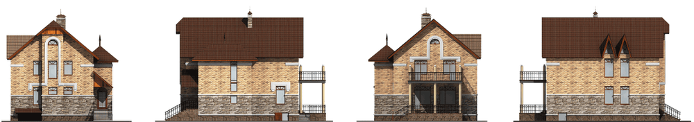 Этот особняк для владельцев небольших кусочков земли, мечтающих о большом и вместительном доме. При общей площади около 250 м2 габаритные размеры дома укладываются в 11 м по обеим осям. Такая компактность плана достигается за счет рациональной планировки и этажности дома. Проектом предусмотрены два жилых этажа, цокольный этаж и чердак, который также может быть оборудован под жилье. В цокольном этаже достаточно развитая зона релаксации соседствует с котельной и гаражом. Расположение гаража на полтора метра ниже отметки земли потребует дополнительных мероприятий по водоотведению и дренажу. На первом этаже традиционно находится гостевая зона. Гостиная, совмещенная со столовой, представляет собой большое помещение с выходом на террасу. Перегородка, отделяющая кухню, может быть передвинута в сторону гостиной, что позволит объединить кухню и столовую в одно помещение, изменив таким образом планировку. На втором этаже расположены три спальни, небольшой кабинет и ванная комната. Две смежные спальни выходят на общий балкон.