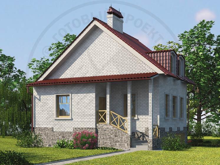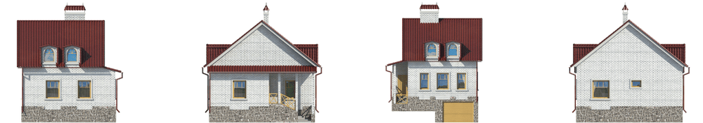 Небольшой, комфортабельный блочный коттедж. В его конструкционной схеме предусмотрены три этажа, используемые максимально полно. В цокольном этаже расположены гараж на две машины и котельная. Планировка первого и мансардного этажей двухчастна. Первый этаж по традиции отдан общественным помещениям и включает в себя тамбур, холл, кухню, санузел и гостиную с камином. В холле предусмотрена гардеробная. Внутренняя лестница соединяет первый и мансардный этаж, в котором располагаются две спальни и объединяющий их холл.