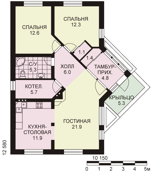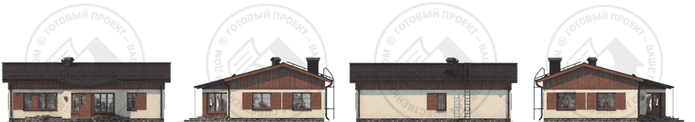 Про этот одноэтажный дом можно сказать, что внутри он больше, чем снаружи. Две просторные спальни, холл, гостиная, кухня-столовая, ванная комната и котельная сосредоточены всего на 80 квадратных метрах. Но объединенное пространство, поддержанное высокими скатными потолками с нарочито подчеркнутыми стропильными фермами и остеклением со всех сторон, создает ощущение действительно большого пространства. Проект вбирает в себя многие из современных тенденций загородного домостроения – он компактный, одноэтажный, открытый окружающей среде. И при этом в нем обеспечен высокий уровень энергоэффективности и безопасности. Даже ставни, характерный элемент декора фасадов, функциональны и позволяют обезопасить дом на время отсутствия хозяев. Теплоемкая каминная печь, расположенная в центре дома, способна быстро прогреть все помещения, сокращая затраты на отопление этого и без того теплого дома. Фасадное и планировочное решения коттеджа позволяют размещать его на участке, «прижимая» к одной из границ, и он наиболее подходит для строительства на небольших узких участках. А в силу свободы конструктивного решения, такой дом можно рассматривать и как дополнительное сооружение в составе домовладения – для целей релаксации или размещения гостей он может быть без проблем перепланирован.