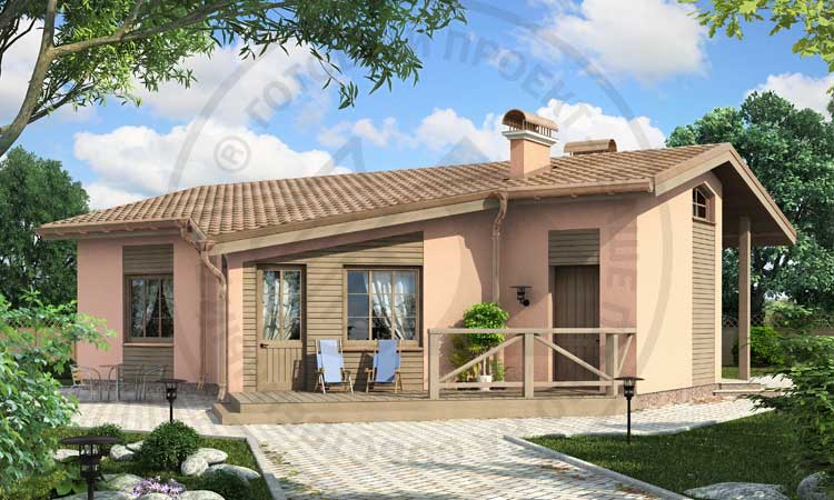 Конструктивное решение не предполагает организацию чердака, и это делает строительство максимально экономичным, а скаты утепленной крыши расширяют внутреннее пространство, делают этот одноэтажный дом действительно просторным.