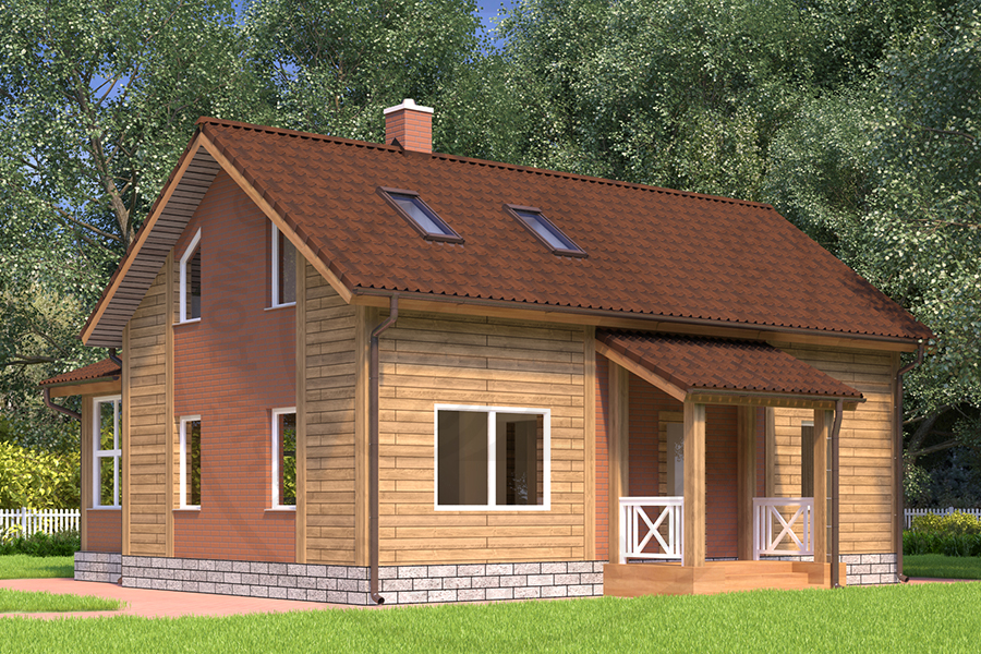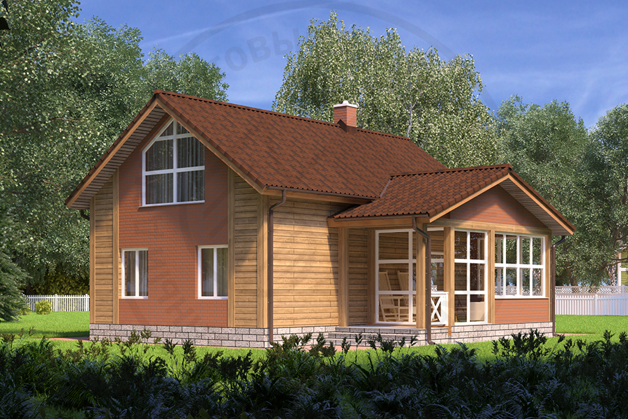 Логичность планов и своеобразие облика при предельной лаконичности архитектурного приема характерны для этого небольшого дома, приемлемого как для сезонного отдыха, так и для постоянного проживания небольшой семьи. Простой прямоугольный план делает его незаменимым для небольшого участка. Кухня-гостиная с камином имеет выход на веранду, из гостиной можно попасть и в мансарду. На первом этаже размещены также две спальни и санузел. Второй этаж запланирован под три спальни, кладовую комнату и ванную.
