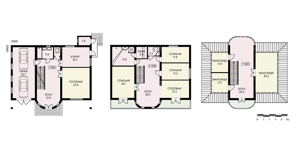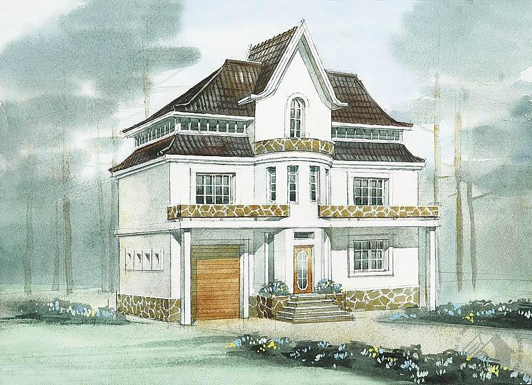 Двухэтажный особняк с подвалом и мансардой, рассчитанный для строительства в теплой климатической зоне. Центром организации внутренних пространств этого дома стали просторные освещенные холлы, которые при соответствующем оформлении могут стать местом для отдыха, приема гостей. Первый этаж в доме решен традиционно: большая прихожая, гостиная, кухня, гараж на два автомобиля. На втором этаже находятся спальни. В мансардном этаже можно организовать студию художника, другие помещения для отдыха и работы, а в летний период можно разместить здесь гостей. В подвале, не показанном на планах, по желанию владельцев