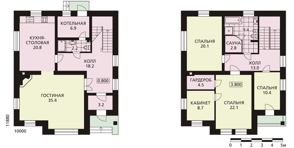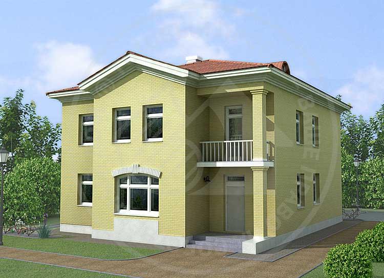 Этот дом – для приверженцев традиционного подхода к организации собственного жилья. Компактный план и архитектурный облик, созданный элементами классического стиля, позволят вписать этот двухэтажный особняк в исторически сложившуюся застройку в черте города. Решение главного фасада с центральным ризалитом, декоративные карнизы и наличники, угловые колонны с капителями – все очень строго и изысканно. А внутренняя планировка рациональна и комфортабельна, хотя и достаточно традиционна. Первый этаж – гостевая зона, второй – спальная. Гостиная удобно связана как с прихожей, так и с кухней-столовой. Второй этаж разработан с учетом современных требований к комфорту жилища: в большой ванной есть мини-сауна, при спальнях – гардеробные. Дополнительно к проекту разработаны зеркальные фасады и планы.