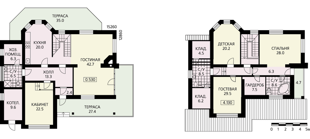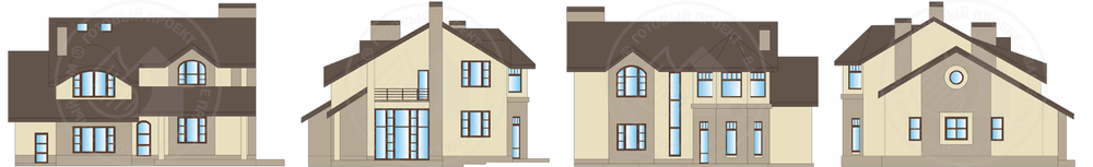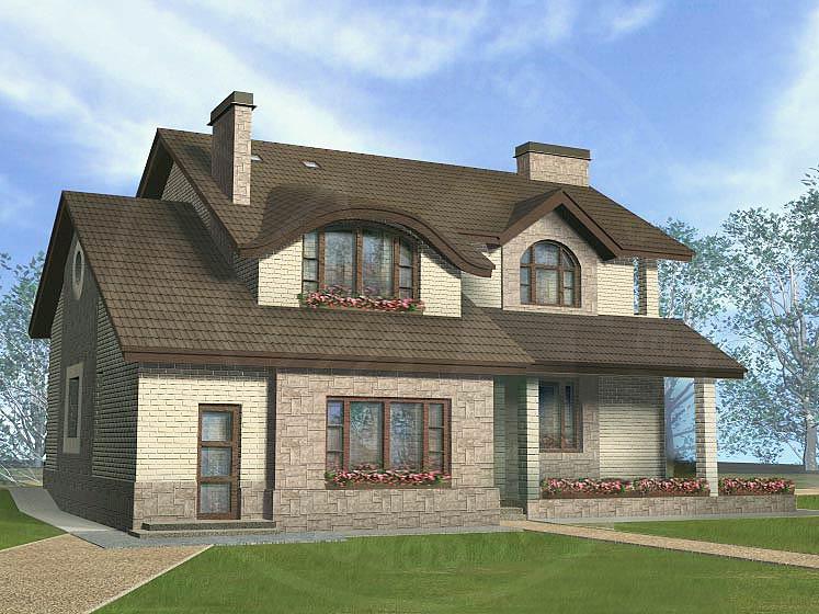 Образец традиционного загородного коттеджа – вместительного, уютного с достаточно спокойной, невычурной, но при этом выразительной архитектурой. В доме предусмотрены два этажа, подвал и чердак отсутствуют. Второй этаж мансардный, при этом в нем задействовано все подстропильное пространство, потолком в помещениях служит крыша дома. Планировка дома также традиционна. На первом этаже расположены помещения, в которых семья проводит время досуга, общения и приятных встреч с друзьями или деловых с партнерами. Для этого в распоряжении обитателей дома просторная гостиная, кухня и кабинет. Дополняют планировку котельная, служебное помещение и санузел. Второй этаж – интимная часть дома. Здесь расположены три жилых помещения, которые могут служить спальнями, детской или гостевой. К достоинствам планировки можно отнести наличие двух кладовых и гардеробной. Этот этаж решен с небольшим перепадом отметок пола.