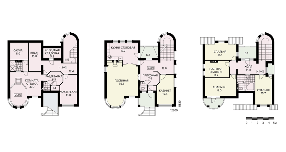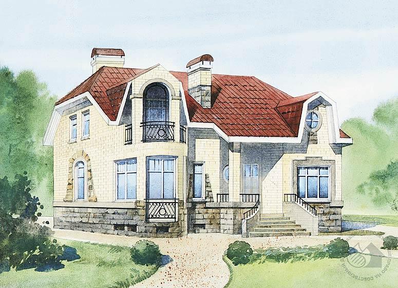 Этот великолепный вместительный, комфортабельный особняк – отличное решение проблемы загородного жилья для многочисленной семьи. И не случайно с первой же публикации он привлек к себе внимание наших заказчиков. Композиция плана дома уравновешена полуциркульными эркерами, которые играют активную роль как в формировании фасадов, так и в организации внутреннего пространства дома. Один из них – наиболее важный элемент в пространстве гостиной, в другом размещается лестница, связывающая все уровни дома. В цокольном этаже находится блок помещений сауны с бассейном и подсобными помещениями. В мансарде – комфортабельная спальная зона.