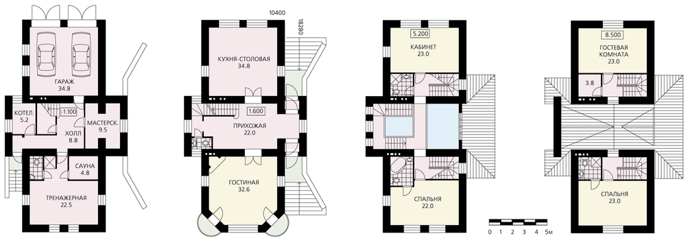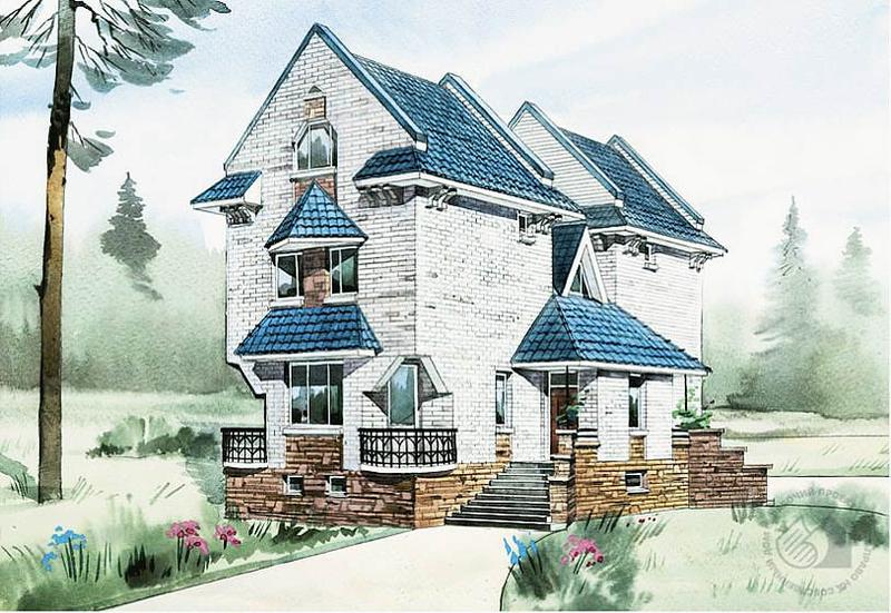 Девизом этого трехэтажного особняка может стать «комфорт и компактность». Оба эти качества вызваны конкретными условиями: требованиями взыскательных заказчиков и особенностями площадки для строительства. Объемно-планировочное решение дома полностью соответствует ситуации, в которой он был возведен: узкий, шириной 15–18 м участок с близко расположенными соседними домами. Дом представляет собой две квадратные в плане башни, объединенные пространством вестибюльного холла с лестницей, связывающей три уровня дома. Такой прием может быть удобен для двух родственных семей, проживающих вместе.