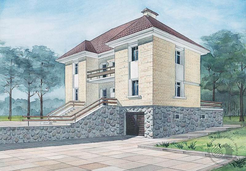Строгость и простота облика, рациональность планировочного решения и большие возможности при привязке на конкретном участке – далеко не все достоинства этого дома. Дом может быть реализован как на ровных площадках, так и на участках с существенным перепадом рельефа. Внутренная планировка решена предельно рационально и вместе с тем не исключает возможности внесения некоторых изменений. В первую очередь это касается помещений, ограниченных перегородками. Жилые комнаты размещены на двух этажах, подсобные помещения – в цокольном этаже. Кроме того, там же находятся большой гараж и блок сауны. Цокольный этаж связан с жилыми уровнями внутренней лестницей и имеет самостоятельный выход на участок.