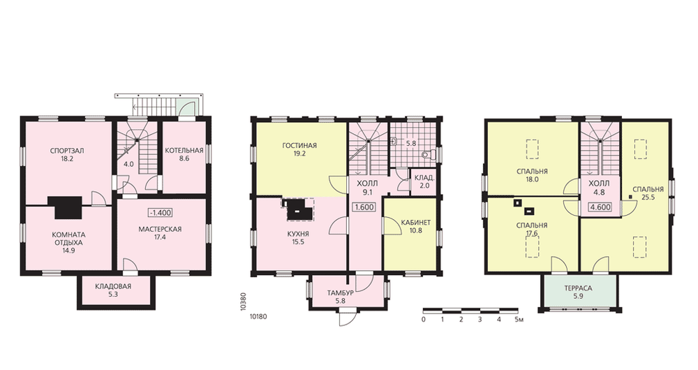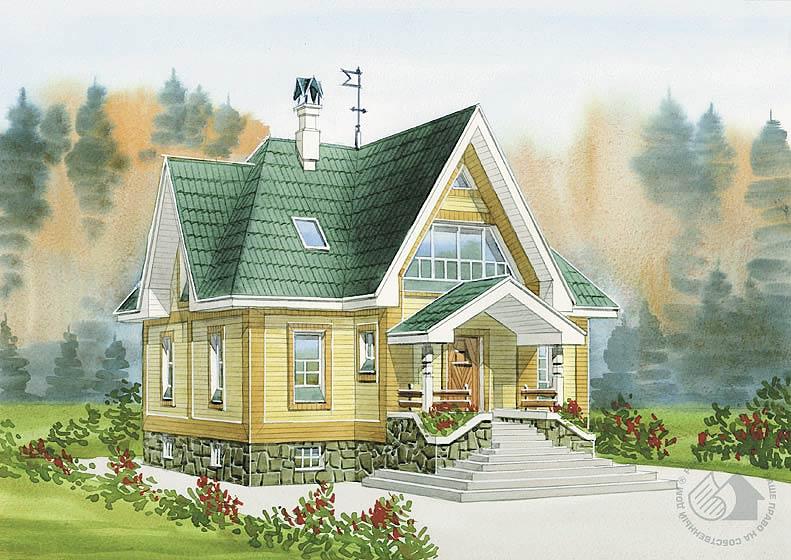 Проект дома из бруса с цокольным этажом и мансардой. Облик дома формируется высокой кровлей и остроконечными фронтонами всех четырех фасадов. Главный фасад симметричен, с высокой парадной лестницей и красиво декорированным крыльцом. Внешний вид во многом зависит от характера отделки. В данном случае могут быть два варианта облицовки фасадов: вагонкой и лицевым кирпичом. Внутренняя планировка отличается простотой и рациональностью. Цокольный этаж заглублен на половину своей высоты, что позволяет сделать все его помещения светлыми. По проекту здесь расположены спортзал, комната отдыха, мастерская, котельная и небольшая кладовая. Котельная имеет свой выход на улицу. На первом этаже половина всей площади отдана гостиной и совмещенной с ней кухне-столовой. Кабинет и ванная комната дополняют планировку. Мансардный этаж – спальная зона.