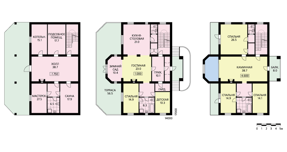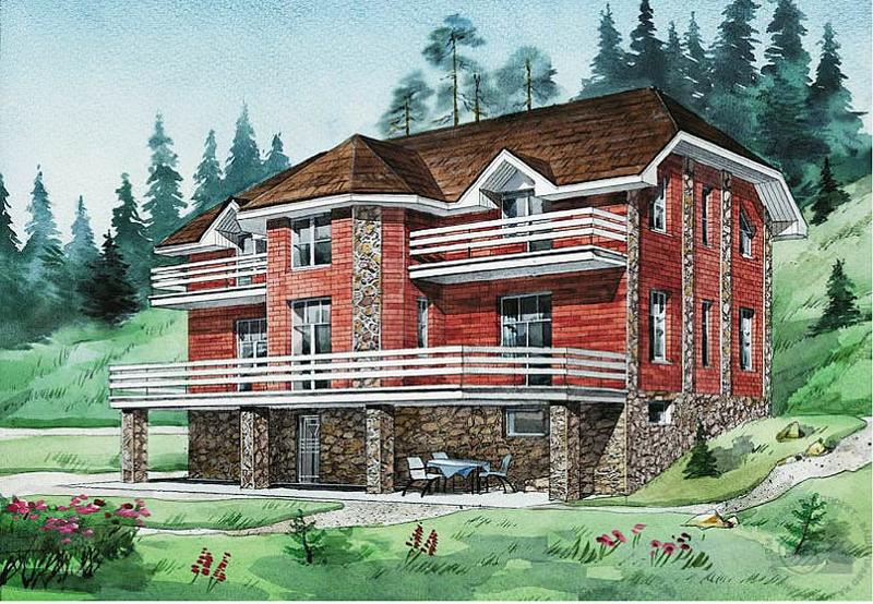 Двухэтажный дом с цоколем идеально подойдет для строительства на участке с большим перепадом рельефа. Этот дом может не только быть местом проживания большой семьи, но и служить небольшой частной гостиницей в одной из курортных зон. В доме нет встроенного гаража, но его вполне возможно оборудовать на месте холла в цокольном этаже. Пожалуй, самым привлекательным элементом первого этажа является большая открытая терраса. Если вы предполагаете использовать дом как семейную гостиницу, то здесь возможно оборудовать летнее кафе. В другом случае это идеальное место для сбора всей семьи и многочисленных гостей. На верхнем этаже находится тихая зона дома, три спальни группируются здесь вокруг большого каминного зала, который по сути является второй гостиной дома.