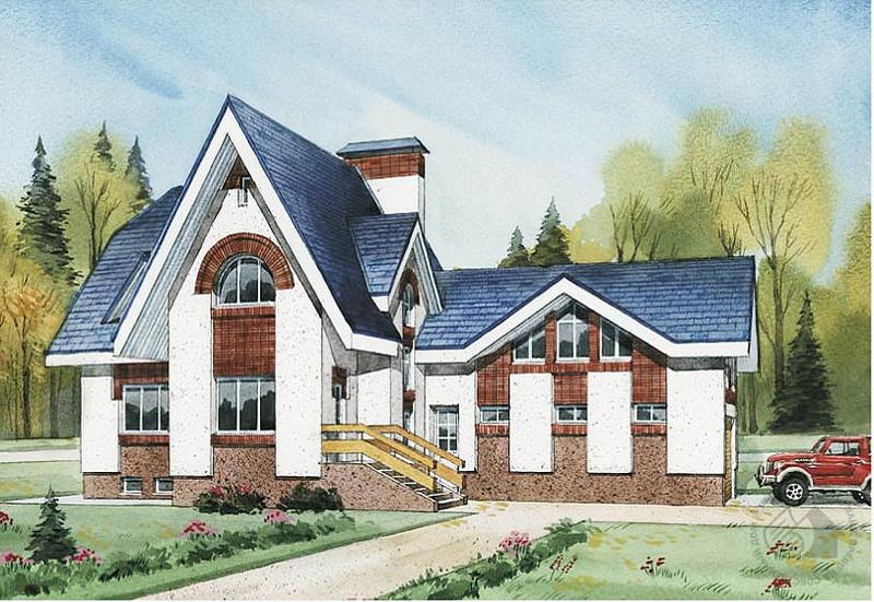 «Дом автомобилиста» – такое название с полным правом может носить этот проект. Гараж является здесь чуть ли не главным элементом дома. А по прорисовке деталей и выверенности пропорций фасадов он может поспорить с основным жилым объемом дома. Но, конечно, большой и красивый гараж – не единственное достоинство этого проекта. В доме есть все помещения, необходимые для комфортной жизни. В цокольном этаже – сауна и тренажерный зал, на первом – большая гостиная-столовая и кухня, в мансарде – три спальни, кабинет и ванная комната. В проекте также предусмотрен небольшой бассейн, расположенный на улице перед домом. Реализация этого предложения остается на усмотрение владельцев дома.