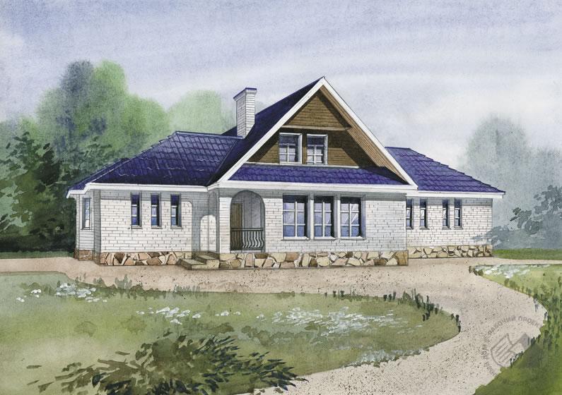 Одноэтажный дом с небольшой мансардой решен в стилистике классической загородной усадьбы. Спокойные, уравновешенные фасады, выверенные пропорции, качественные отделочные материалы придают основательность и солидность этому каркасному сооружению. Центральное место в доме занимает санитарно-гигиенический блок, вокруг которого группируются все помещения первого этажа. Если учесть, что в доме есть большой гараж на два автомобиля, то состав помещений вполне позволит использовать дом не только как полноценное жилье для большой семьи, но и как место отдыха сотрудников небольшой компании. Большое помещение кухни-гостиной позволит собраться вместе всем многочисленным обитателям и гостям этого дома. А отдохнуть они смогут в комфортабельной спальной зоне мансардного этажа.