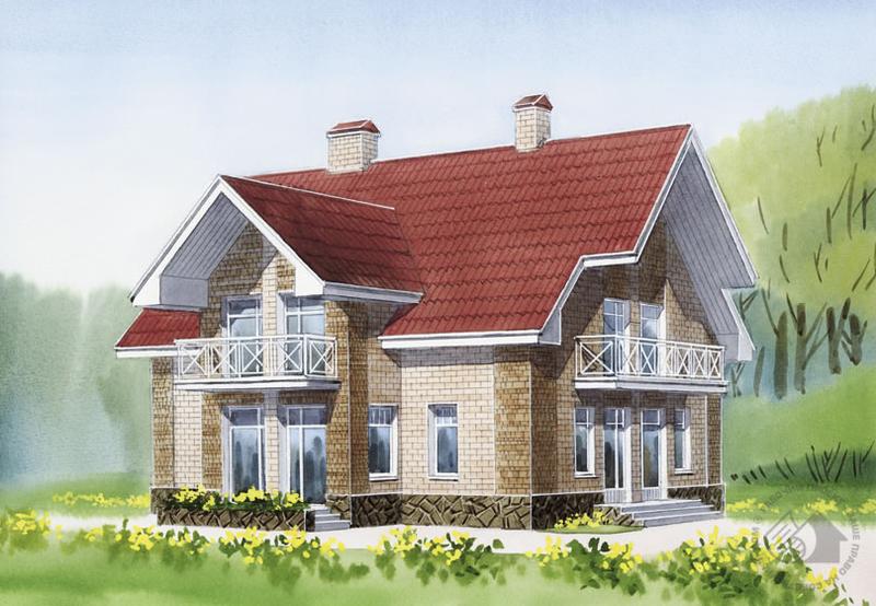 Небольшой, очень симпатичный дом, рассчитанный на семью со средним уровнем доходов. Его изюминкой является одинаково внимательное отношение к прорисовке всех четырех фасадов. Дом не имеет глухих стен, задних фасадов, он хорош и интересен абсолютно с любого ракурса. Это дает неограниченные возможности при его посадке на участок. Логична и рациональна внутренняя планировка дома. На первом этаже располагаются помещения зоны общения: гостиная с камином, смежная с ней кухня-столовая и отделенный прихожей кабинет. Также здесь находятся подсобно-бытовые помещения: хозяйственная кладовая и санузел. На втором этаже организована зона отдыха с четырьмя спальнями, большой ванной комнатой и кладовой. В доме есть чердак, попасть на который можно по откидной лестнице через лаз-люк.