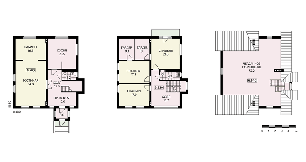 Достаточно традиционный по своему объемно-планировочному решению особняк с двумя жилыми этажами и большим чердаком. Все помещения расположены выше уровня земли. Наличие единственной продольной несущей стены в центре дома позволяет достаточно свободно обращаться с его внутренней планировкой. И в первую очередь это относится ко второму этажу, где за счет подвижки перегородок можно изменить габариты и площади спален. Чердак также может быть переоборудован под полноценное жилье, утеплен и освещен с помощью мансардных окон. В меньшей степени может быть подвержен корректировке первый этаж, площадь которого поделена между гостиной с кабинетом, кухней и прихожей. Хотя и здесь возможны варианты, например можно отказаться от перегородки с кабинетом, увеличив таким образом гостиную.