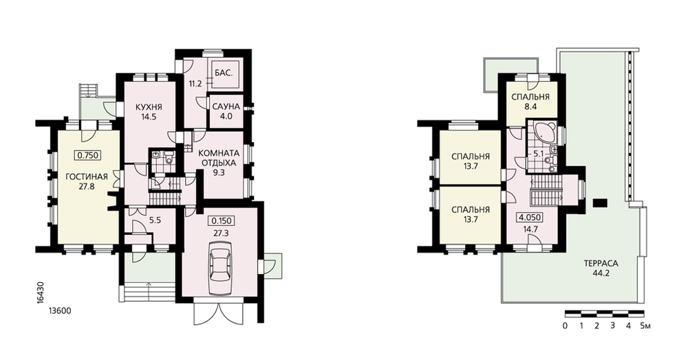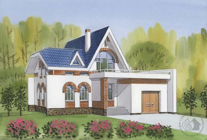 Дом с террасой наиболее актуален в теплом климатическом регионе, где весеннее таянье снега не будет вызывать серьезных проблем с протечками кровельного покрытия, а в данном случае пол террасы – это крыша первого этажа дома. Всего в доме два этажа, один из которых мансардный. Планировка первого этажа достаточно традиционна, к жилой части дома с гостиной и кухней-столовой примыкает хозяйственно-технический блок, включающий гараж и зону релаксации. В проекте очень удобно решена внутренняя связь между этими блоками, каждый из них имеет самостоятельный выход на улицу. На мансардном этаже расположены три спальни и ванная комната. А из холла можно выйти на ту самую замечательную террасу, о которой говорилось выше. Здесь можно устроить солярий, поставить теннисный стол или даже организовать оранжерею под открытым небом.