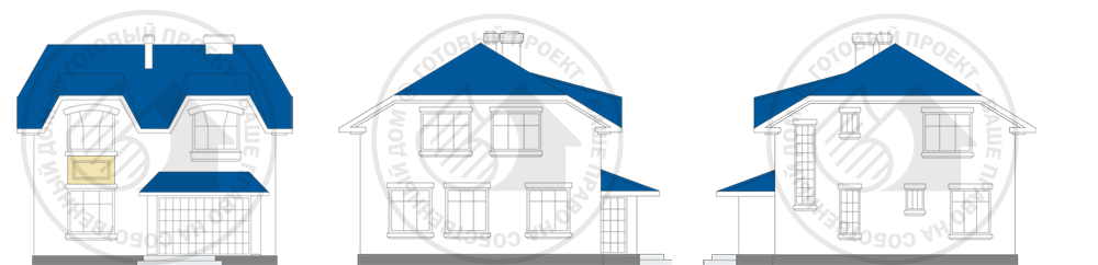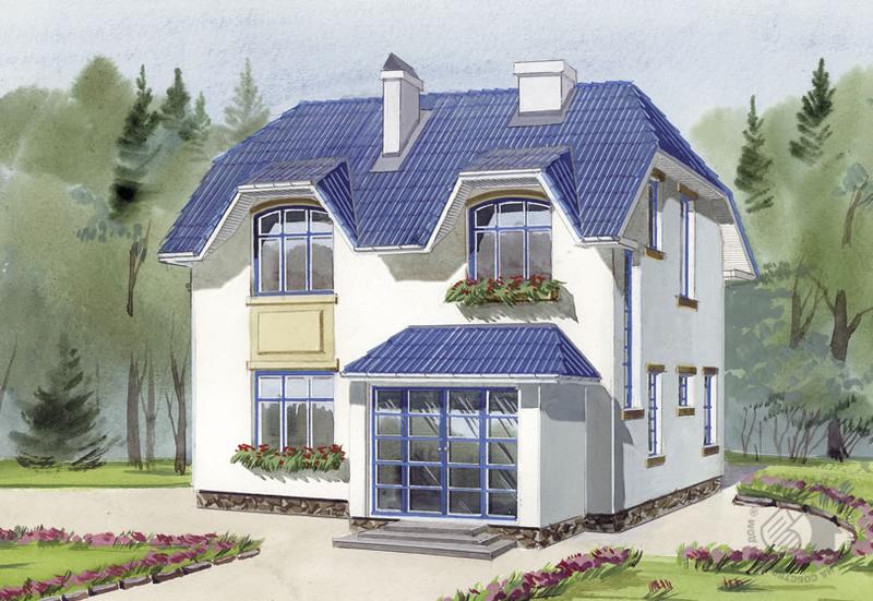 Дом, который по праву можно отнести к категории домов эконом-класса. Небольшой по площади, без заглубленного цокольного этажа, с рациональной планировкой и лаконичными, лишенными каких-либо излишеств фасадами, он будет вполне доступен представителям среднего класса. И пусть вас не смущает его внешняя непритязательность, она вполне может быть сглажена с помощью современных отделочных материалов и высокого качества строительных работ. В плане дом представляет собой квадрат, с одной несущей внутренней стеной. На первом этаже расположены гостиная и кухня-столовая, разделенные между собой перегородкой, а также небольшая спальня, ванная комната и топочная. Мансарда полностью отдана спальной зоне дома, почти всю ее площадь занимают три спальни и небольшая ванная комната. Планировка и площади спален вполне позволяют оборудовать их встроенными шкафами или гардеробными.