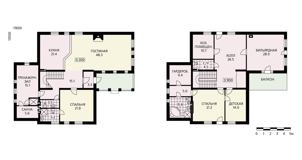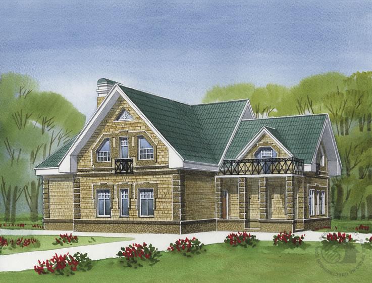 Современный особняк, решенный в сдержанной архитектурной стилистике. Сдержанность в данном случае проявляется в деликатном отношении к прорисовке деталей фасадов. В доме два этажа и чердак. На первом этаже холл, гостиная и кухня-столовая образуют единый блок, частью которого является двухмаршевая лестница, ведущая на второй этаж. Через небольшой тамбур можно попасть в тренажерный зал с сауной и душевой. Еще на первом этаже расположена спальня со своим санузлом. Мансардный этаж решен с учетом самых современных требований к комфорту. Здесь расположены спальня родителей и детская, связанные между собой проемом. Они оборудованы ванной комнатой и большой светлой гардеробной. Бильярдная может быть переоборудована под спальню. Постирочная, гладильная и кладовая – подсобные помещения мансардного этажа. На чердак можно попасть через лаз по откидной лестнице.
