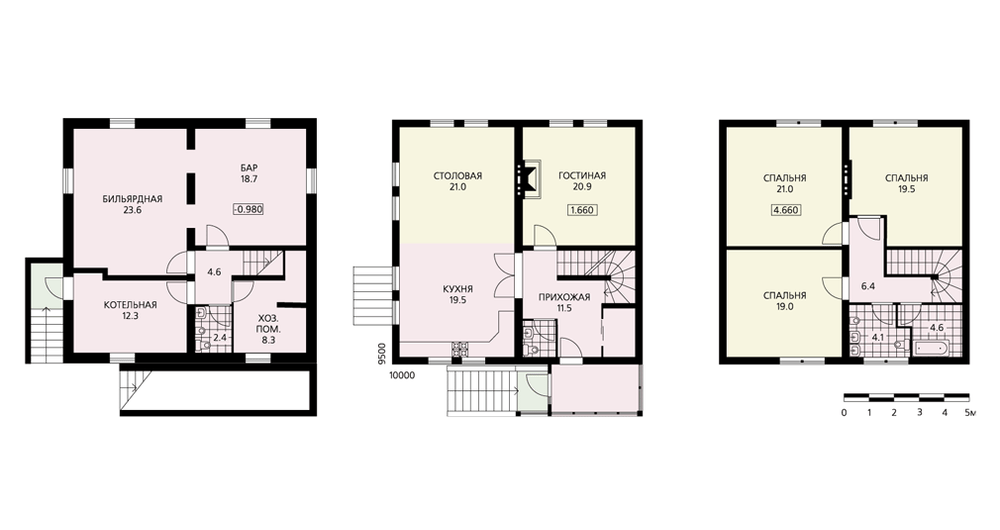 Далеко не всегда следует отказываться от простоты, тем более если за ней стоят рациональность и добротность, как в данном случае. Внешне непритязательный, почти квадратный в плане, этот дом привлечет внимание прежде всего своей экономичностью и рациональностью, достигнутой, впрочем, не в ущерб комфорту и удобству проживания. Дом для заказчиков, не стремящихся к внешнему эффекту, но умеющих оценить содержание. В доме три этажа с четким функциональным разграничением. Цокольный этаж, заглубленный меньше чем на половину своей высоты, имеет естественное освещение. Это дает возможность расположить здесь такие помещения, как бар и бильярдную. Котельная и небольшое хоз. помещение также имеют естественное освещение. На первом этаже целый пролет дома занимает кухня-столовая, по площади она в два раза больше гостиной. В мансарде на три спальни приходятся две небольшие ванные комнаты.