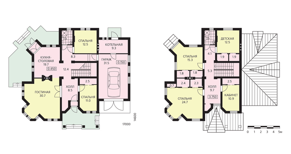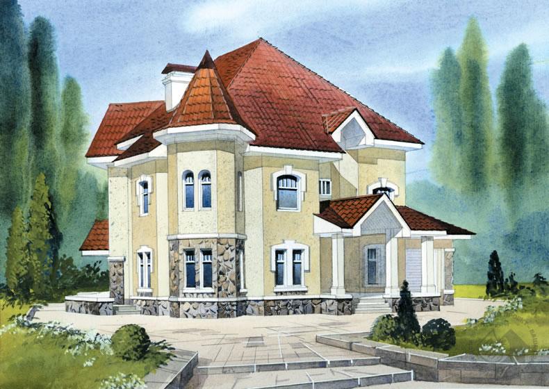 Изысканный особняк с элегантной угловой башенкой. Дом для состоятельных заказчиков, ценящих не только комфорт, но и с трепетом относящихся к собственному имиджу. Внутренняя планировка учитывает интересы всех членов большой, разновозрастной семьи. На первом этаже гостевые помещения дополнены двумя спальнями. Одна, непосредственно при входе, для беспокойного тинейджера, возвращающегося домой за полночь. И вторая – совмещенная с ванной и изолированная от других помещений, для старшего члена семьи. Интересна и гостевая зона. Кухня-столовая и гостиная разделены двусторонним камином. Если отказаться от небольшой перегородки, можно объединить эти помещения в одно. Из кухни-столовой есть выход на террасу. Гараж и котельная находятся на уровне земли в одноэтажной пристройке. На втором этаже расположены спальня родителей, две детские спальни и кабинет, все они оборудованы гардеробными.