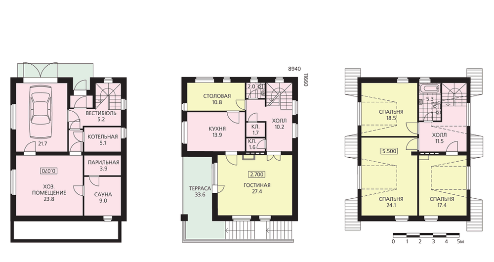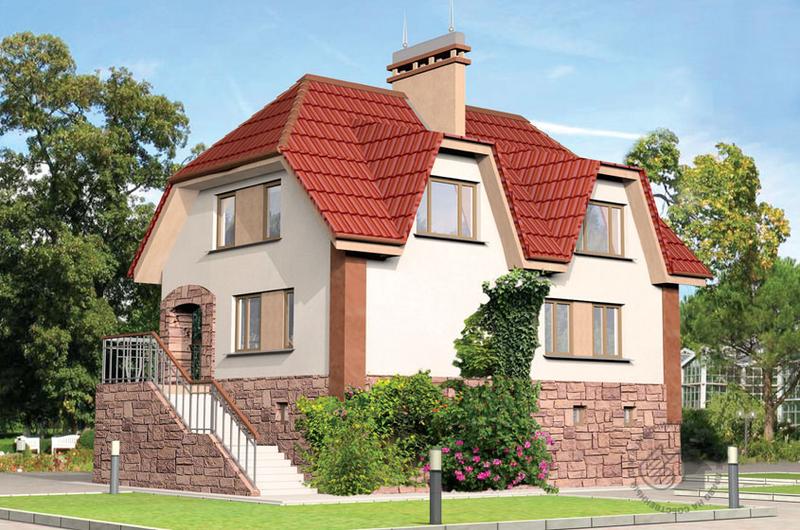 Этот компактный кирпичный дом как будто специально создан для маленького, узкого участка да еще со сложными грунтами. Соответствие проекта таким сложным условиям редко встречается в нашей коллекции, что делает этот дом уникальным. При относительно большой площади его габариты всего 8х11 м. В плане дом представляет собой прямоугольник без выступающих элементов и сложных геометрических форм. Цокольный этаж находится на отметке земли, без заглубления, что упрощает и удешевляет строительство. Вход в дом также организован с уровня цокольного этажа. Из небольшого вестибюля можно попасть в гараж, в служебные и технические помещения или подняться по лестнице на первый, жилой этаж. Он решен как традиционная гостевая зона с гостиной, кухней, столовой. Из гостиной через террасу можно спуститься на улицу. В мансарде расположены три спальни и небольшая ванная комната.