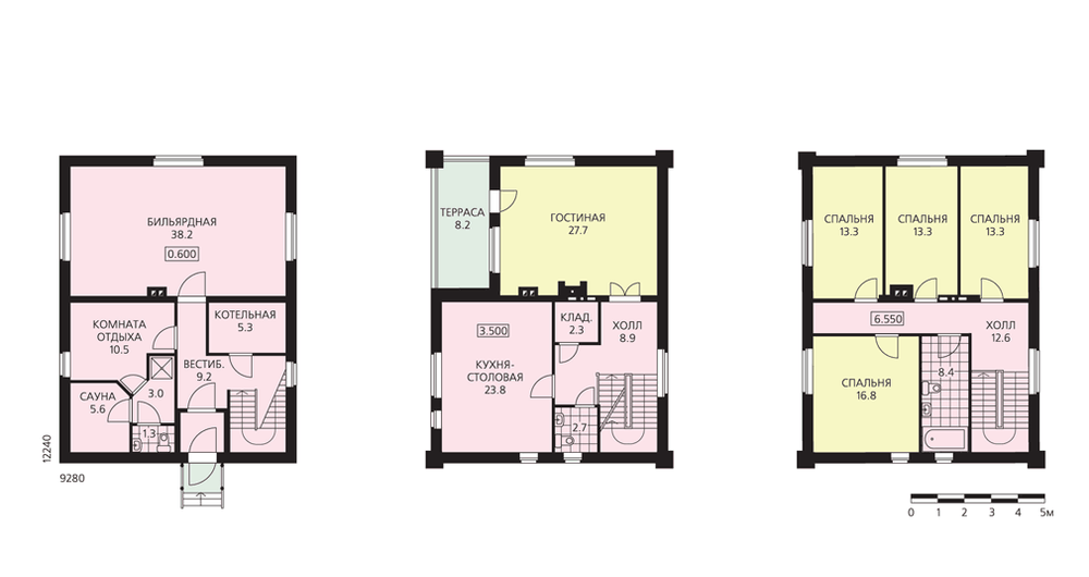 Дом, девиз которого – компактность и рациональность. Небольшое пятно застройки, строгая геометрия прямоугольного плана без выступающих элементов делают возможным «посадку» этого достаточно большого дома на маленький участок. К его особенностям можно отнести и принцип вертикального, поэтажного зонирования. Традиционно жилой первый этаж здесь отдан зоне релаксации с сауной, душевой и бильярдной. Расположение этих помещений выше отметки земли позволяет иметь в них дневное освещение. Второй этаж – гостевая зона дома с просторной гостиной и кухней-столовой. На третьем этаже расположены четыре спальни и ванная комната. Планировка этого этажа выполнена в перегородках, а следовательно, может быть трансформирована. Можно изменить площади и габариты спален, например, отказавшись от перегородки между двумя смежными, получить одну большую спальню с двусторонним освещением.