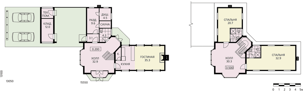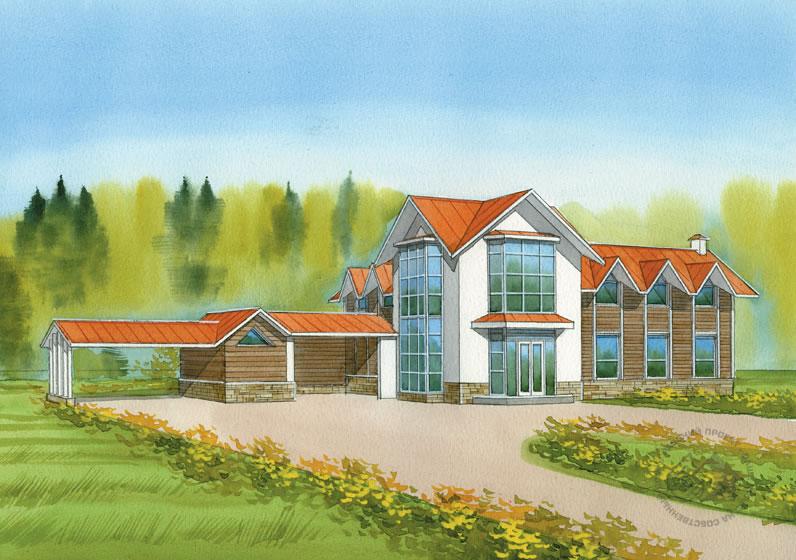 Нестандартная форма плана в сочетании с высоким уровнем комфорта и своеобразным архитектурным решением привлекут к этому дому внимание любителей новаторских идей и экспериментов. Дом необычен как внешне, так и планировочно, но при этом очень комфортабелен. Подтверждение этому и четкое функциональное зонирование, и вынесение технических помещений за пределы жилой части дома. В целом дом можно рассматривать как жилой комплекс, состоящий из жилой части, хозблока и соединяющего их навеса для машин. В центре планировки первого и второго этажей расположены просторные холлы. Два боковых крыла на первом этаже распределены между гостевой зоной и зоной релаксации, на втором этаже – оба отданы под спальни. Центральные лестничные холлы – великолепные, светлые пространства с витражами на всю высоту. Центральная часть дома выполнена из газобетона, «боковые крылья» – из бруса.