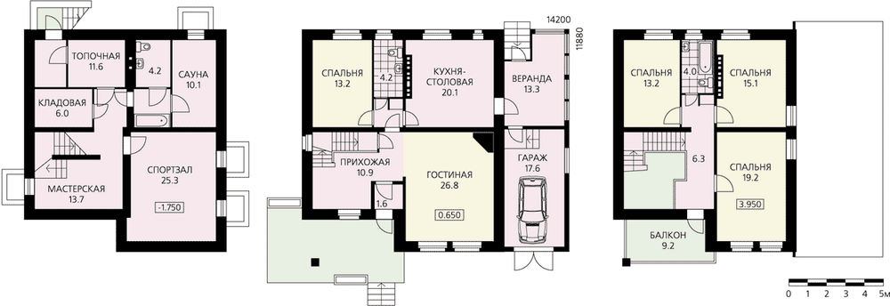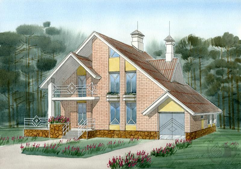 Мансардный дом с гаражом – достаточно традиционный для загородного строительства. При относительно небольшой общей площади он очень вместительный и комфортабельный. В подвале расположены блок релаксации с сауной и просторным, светлым спортивным залом, а также технические помещения. Первый этаж представляет собой блокировку жилой части дома, выполненную в капитальных стенах, и гаража с верандой в легких конструкциях (толщина стены здесь 250 мм). Самое большое помещение первого этажа – гостиная, которая составляет вместе с прихожей единое помещение. Также на первом этаже расположены кухня-столовая и небольшая спальня. Из кухни через веранду организован второй выход из дома. Мансарда – традиционная спальная зона дома – решена очень рационально и лаконично. Ее планировка представлена тремя спальными комнатами и ванной.