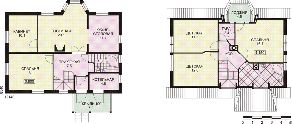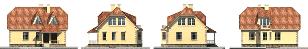 В этом небольшом мансардном доме авторам удалось воплотить образ уютного семейного очага, патриархальных семейных традиций. При этом дом современный, с удобной, комфортабельной планировкой и рациональным конструктивным решением. Он покоится на ж/б монолитной плите с ростверком, практически не заглубленной по отношению к отметке земли, что позволит возводить дом на сложных грунтах. Первый этаж на 80 см поднят от отметки земли. Здесь расположены гостиная, смежные с ней кухня и небольшой кабинет. Гостиная оборудована камином и имеет небольшой эркер. При входе в дом расположены котельная, ванная комната и спальня первого этажа. Планировка мансарды максимально рациональна и при этом достаточно комфортна, что достигается отсутствием коридоров и избыточных по площади холлов. Три спальни, гардеробная и просторная ванная комната выходят в небольшой лестничный холл. Проект имеет варианты материала наружных стен: газобетон (с несколько большими площадями помещений) и деревянный каркас.