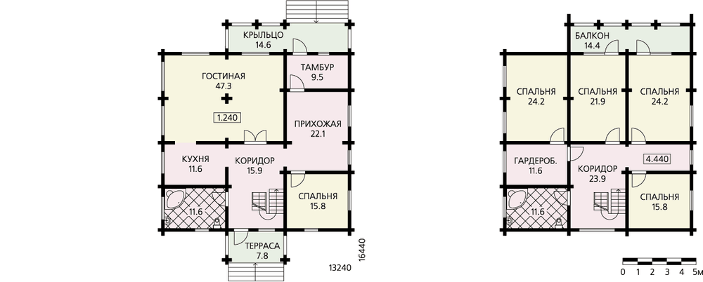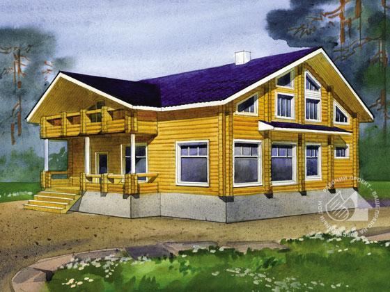 Комфортабельный, бревенчатый особняк, рассчитанный на многочисленную семью. Большие габариты здания с вступающими за основной контур лестницами, крыльцом и террасой потребуют и большого участка для строительства. Но большие габариты позволяют получить и большие помещения, и всю внутреннюю планировку решить свободной и просторной. В доме два этажа, второй – мансардный. Первый этаж больше чем на метр поднят над уровнем земли. Основной вход решен через тамбур и просторную, светлую прихожую. С противоположного фасада есть еще один вход – через небольшую террасу. Огромная, почти квадратная гостиная – основное помещение первого этажа. Смежно с ней расположена кухня. Спальня и большая светлая ванная комната дополняют планировку этого этажа. На мансарде расположены четыре спальни, гардероб, ванная и коридор с естественным освещением. Из двух спален запроектированы выходы на общий балкон. Это удобный и красивый современный дом для состоятельных заказчиков, ценящих комфорт.