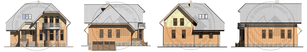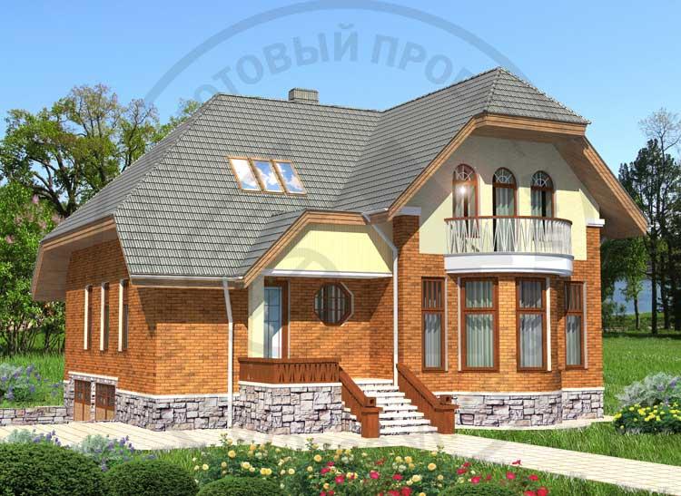 Современный коттедж с мансардным этажом под скатной кровлей и гаражом на два автомобиля в цокольном этаже. Габариты дома хорошо подходят для небольшого участка. Выразительность главного фасада подчеркивается четко организованным парадным входом и овальным эркером с балконом.