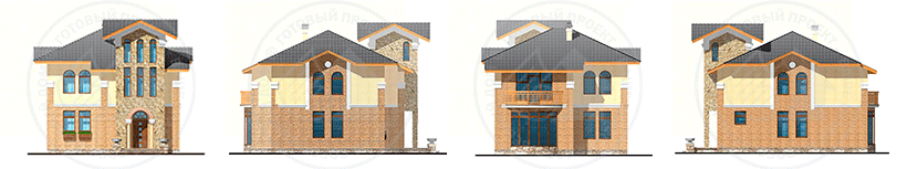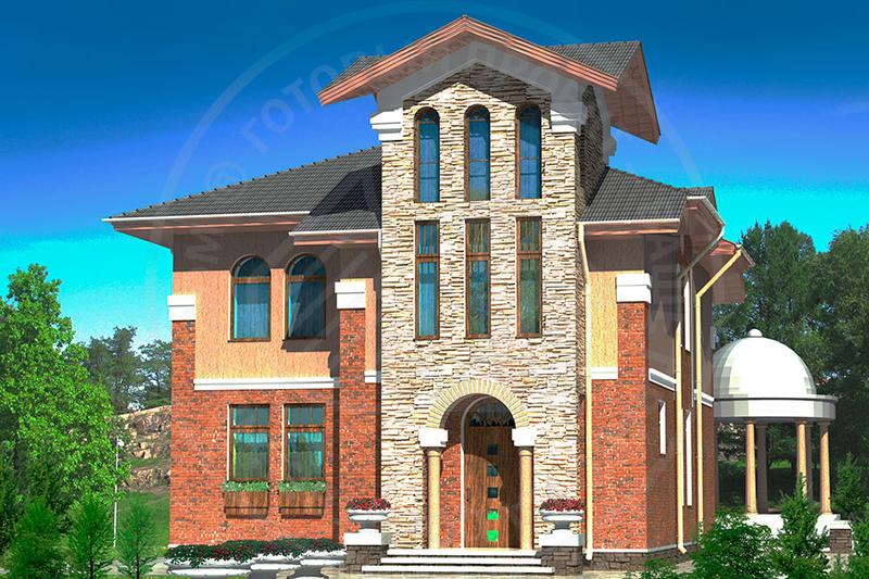 Коттедж, в архитектуре которого активно используются тосканские мотивы, рассчитан на семью, полюбившую итальянскую культуру. Изящное здание с башней над главным входом, с тонко прорисованными архитектурными деталями и удобной планировкой помещений. Выразительность главного входа за счет арочного портала, обрамленного парой колонн. Здание двух - трех этажное, без подвала и цокольного этажа. Планировка первого этажа решена по четкой схеме. Уютная гостиная с камином совмещена со столовой, вместе они образуют общее пространство. В гостиной широкий овальный витраж. Деревянная лестница на втором этаже размещена в прихожей. На втором этаже три спальни и ванная комната, они сгруппированы вокруг просторного светлого холла , из главной спальни можно выйти на балкон овальной формы . По небольшой лестнице можно попасть в башню третьего этажа с хорошим обзором окрестностей.