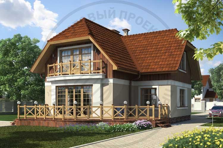 Проект газобетонного дома в характерном немецком стиле с черепичной вальмовой кровлей и элементами дерева на фасадах. Интересно выделение одного из фасадов в качестве второстепенного, «глухого», что позволяет без ущерба разместить дом по одной из границ застройки, полностью развернув его на участок.