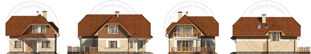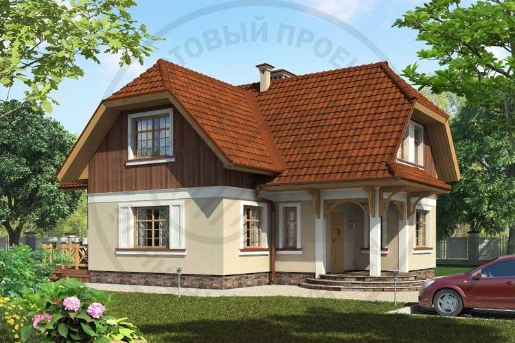 Проект газобетонного дома в характерном немецком стиле с черепичной вальмовой кровлей и элементами дерева на фасадах. Интересно выделение одного из фасадов в качестве второстепенного, «глухого», что позволяет без ущерба разместить дом по одной из границ застройки, полностью развернув его на участок.