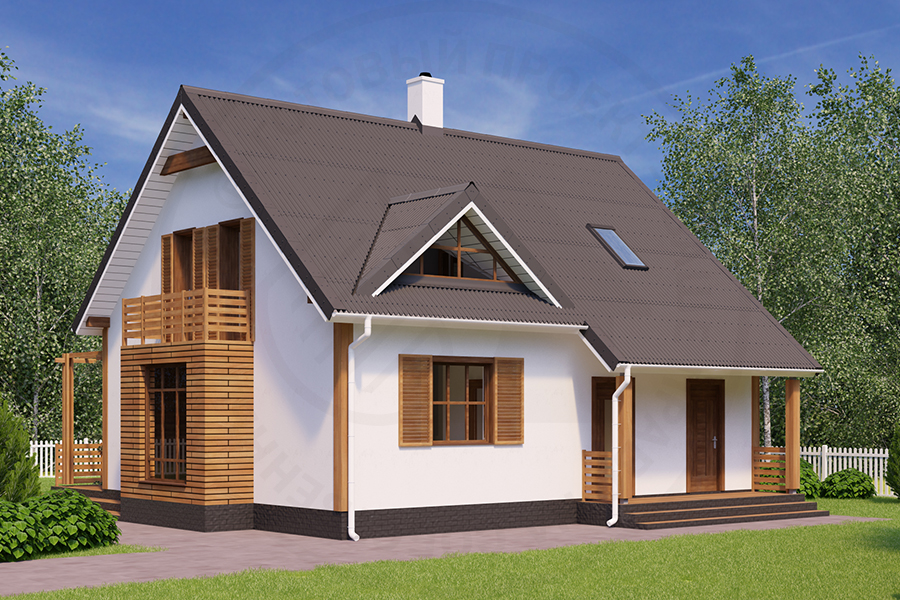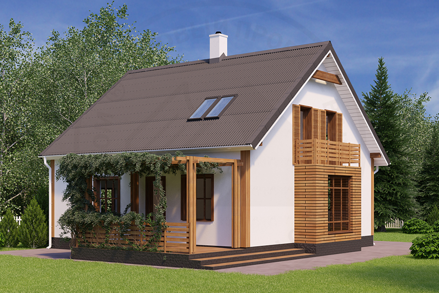 Компактный дом из газобетона с мансардным – находка для небольшой семьи, мечтающей о собственном загородном доме. Дом экономичен и комфортен одновременно. Экономичность – результат рациональной планировки и конструктивной схемы. В доме отсутствует подвал (как правило, дорогое удовольствие) и чердак. Мансарда используется полностью. Комфортабельность дома - продуманная планировка. Центральным помещением первого этажа является двусторонняя гостиная, имеющая выход на террасу. Также тут запланированы котельная, гостевая, санузел и прихожая. В мансардном этаже находятся детская комната, спальня, ванная и кабинет, который, впрочем, может служить дополнительной спальной комнатой.