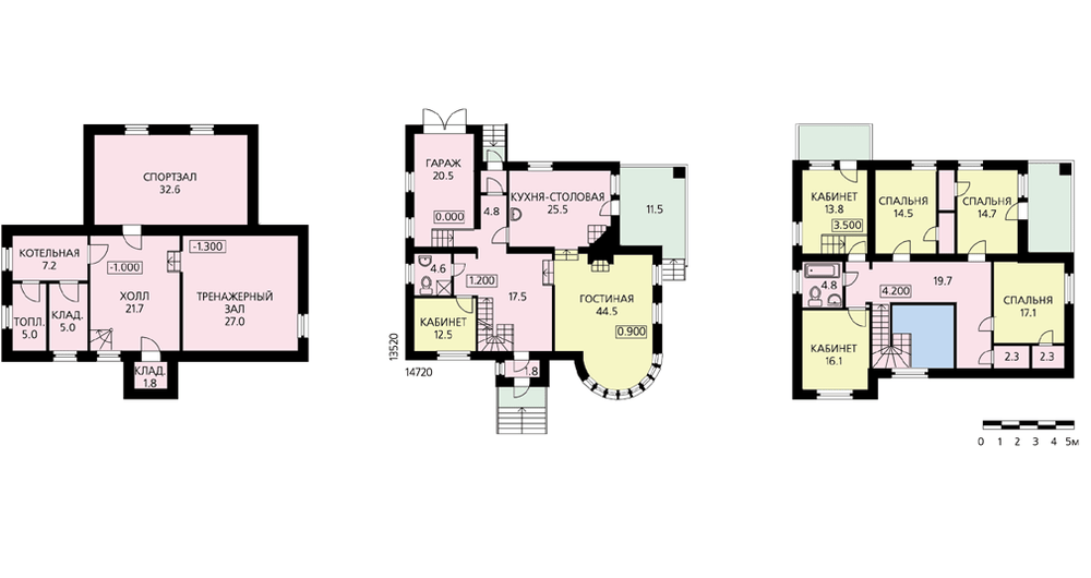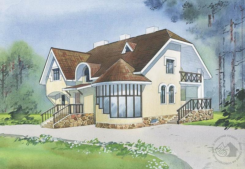 Двухэтажный кирпичный дом с подвалом имеет два входа, что улучшает его связь с участком. На первом этаже расположены помещения дневного пребывания – большая гостиная с полукруглым эркером и камином, кухня-столовая с выходом на террасу, кабинет, большой двусветный холл с открытой лестницей и санузел. На втором этаже – пять комнат, которые могут использоваться как спальни, кабинет или комнаты для гостей, здесь же находится ванная. В подвале предусмотрены тренажерный и спортивный залы, котельная и кладовые. Яркий архитектурный облик коттеджа создается различными формами окон, разнообразным силуэтом крыши.