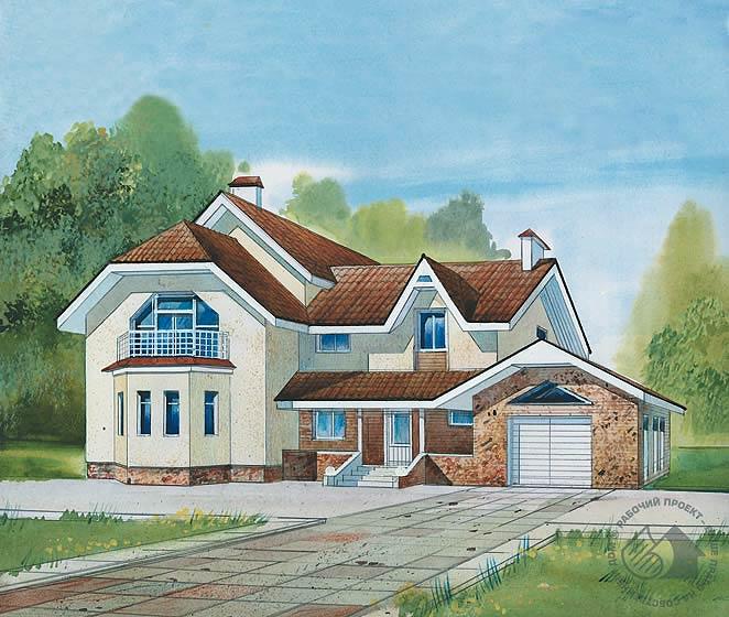 Выразительность облика этого вместительного особняка создана ярусным построением объема и силуэтом крыши. Структура дома проста: жилая часть выстроена в два этажа, а одноэтажная пристройка с гаражом объединена с крыльцом общей крышей. Планировка дома удобна тем, что все его помещения размещены компактно и на каждом этаже объединены центральным холлом с лестницей. Не выходя из дома, можно попасть в гараж и подсобные помещения, имеющие выход на участок. Граненые эркеры комнат первого этажа не только композиционно уравновешивают план, но и усиливают выразительность облика дома и украшают пространство комнат.