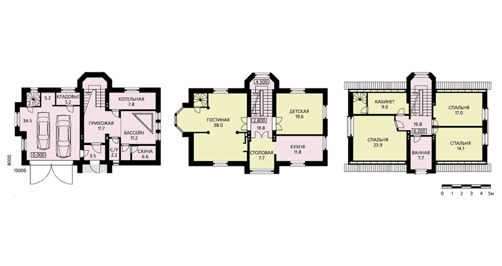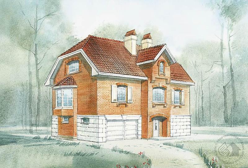Облик этого дома позволит вписать его как в городскую среду кварталов коттеджной застройки, так и в живописный природный ландшафт. Проект дома может быть реализован на участке с высоким уровнем грунтовых вод, так как все этажи дома находятся выше уровня земли. На отметке входа запроектированы входная зона с прихожей и лестницей на верхние уровни дома. Второй и мансардный этажи решены традиционно: на втором этаже группа помещений для общения и дневного отдыха семьи, на мансардном – спальни. Если включить в данный проект мансардные окна, можно дополнительно осветить спальные комнаты и винтовую лестницу, а также добавить естественный свет в кабинет.