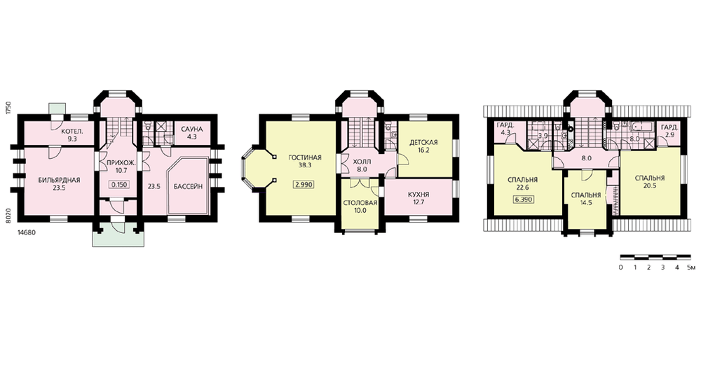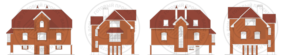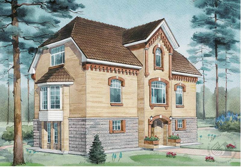 Современный особняк, выполненный в лучших традициях коттеджного домостроения. Главный фасад решен строго симметрично. Подчеркнуто-парадный главный вход расположен в центральном ризалите. В архитектурно-планировочном решении отчетливо прослеживается стремление заказчиков к основательности в устройстве быта. Первый этаж представляет собой служебную часть дома с бассейном, сауной, большой бильярдной. В центральном пролете находится лестница, ведущая на второй этаж и мансарду. Второй этаж – гостевая часть дома с просторной гостиной, украшенной остекленным эркером, кухней, столовой и детской. В мансарде по обе стороны центрального пролета расположены две комфортабельные, просторные спальни, каждая со своей ванной комнатой и кладовой. Еще одна небольшая спальня расположена в центральном пролете напротив лестницы. Проект имеет вариант с гаражом на две машины – вместо бильярдной.