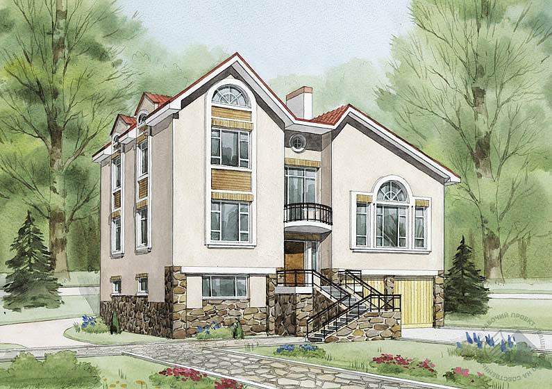 В этом доме есть где разместиться большому семейству. Количество и размеры комнат дадут возможность принимать многочисленных гостей и с комфортом отдыхать. Парадным помещением дома является просторная двусветная гостиная с камином и деревянной лестницей, ведущей на второй этаж. В цокольном этаже расположено множество служебных и хозяйственных помещений. Вместительный гараж и большую мастерскую особенно оценят рачительные хозяева, как и небольшой подвал, не показанный на планах. Строгая уравновешенность пропорций фасадов, парадное решение главного входа создают ощущение стабильности и незыблемости традиций. Это дом вне времени, для многих и многих поколений.