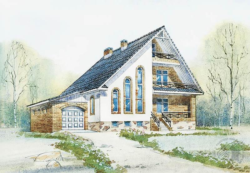 Экономичный и довольно вместительный загородный дом. Жилую часть дома можно построить на достаточно узком участке. Просторная прихожая, кабинет, двусветная гостиная и кухня-столовая удобно связаны между собой. Из прихожей можно спуститься в подвал, а из гостиной – подняться на второй этаж, где запроектированы три большие спальни и ванная. Еще две спальни размещены на верхнем ярусе мансарды. Двусветное пространство гостиной формируется скатом крыши, и это позволит дополнительно осветить гостиную мансардными окнами. В подвале, не показанном на планах и расположенном под основной жилой частью дома, помимо котельной и хозяйственных помещений могут быть устроены любые необходимые хозяевам помещения.