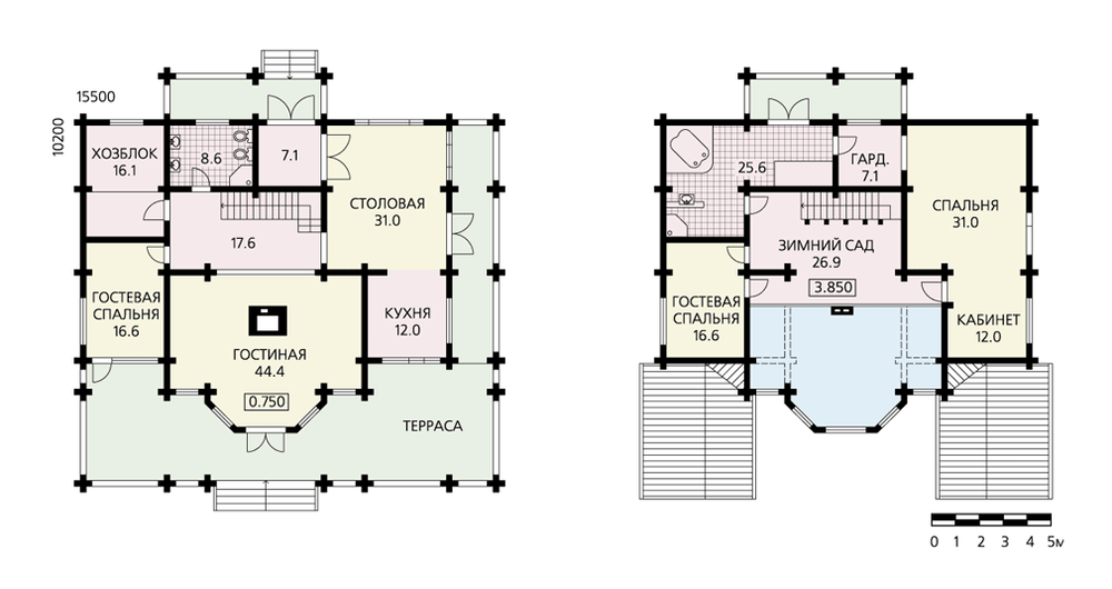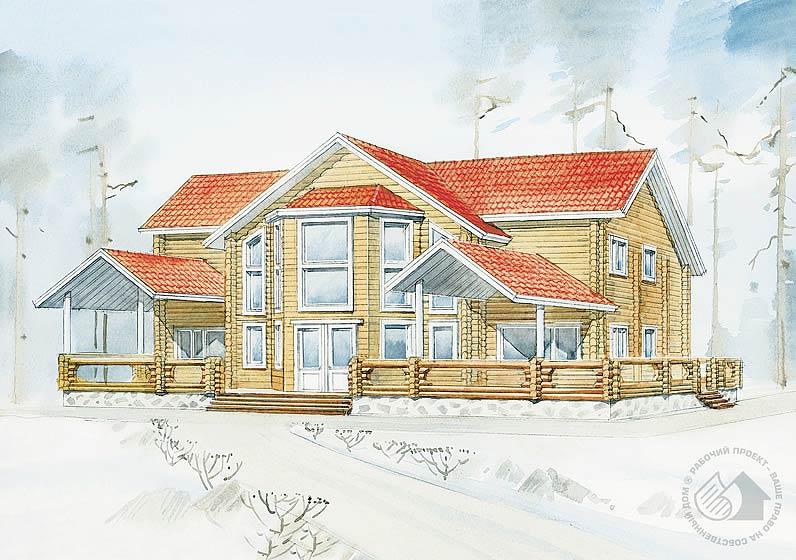 Внешнее своеобразие, планировка, разработанная с учетом современных представлений о жилище, – далеко не весь перечень особенностей этого привлекательного дома. Использование в качестве основного строительного материала деревянного бруса или бревен подчеркивает стильность облика этого дома. Основные помещения дневного пребывания имеют удобную связь и хороши для приема гостей. Особенно великолепно «перетекающее» пространство холла и гостиной с красивым эркером. В двусветную часть этого пространства раскрывается холл-зимний сад второго этажа. Помещения первого этажа дома связаны с прилегающим садом: из гостиной и столовой можно выйти на просторные террасы.