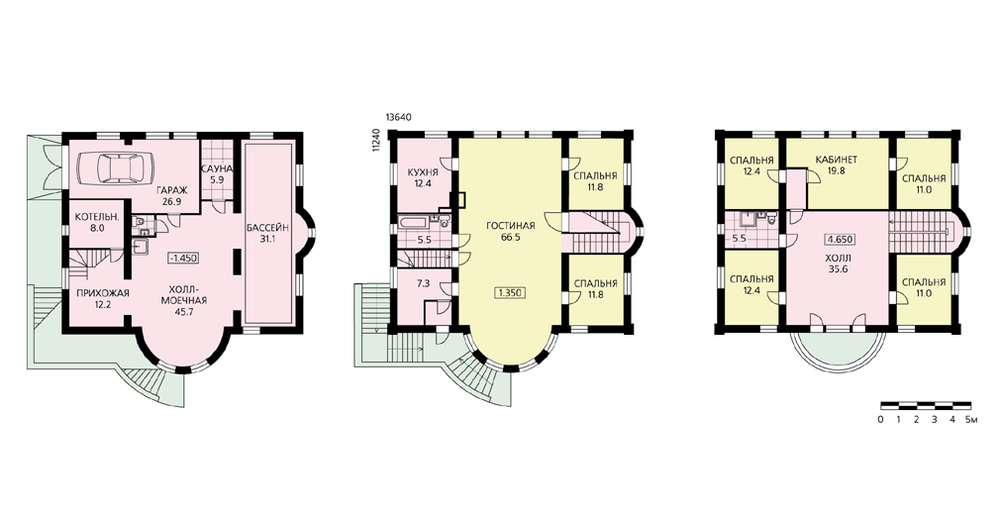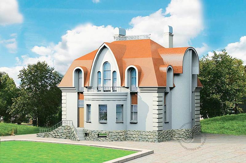 Коттедж класса люкс проектировался для живописных пригородов большого города. В нем есть все необходимое не только для комфортабельного отдыха, но и для высококлассного приема гостей. Большую часть цокольного этажа занимает зона релаксации: бассейн, сауна, холл, который вполне может стать тренажерным залом. Из цокольного этажа можно попасть непосредственно в гостиную – большое, светлое помещение с полукруглым эркером. Две спальни, расположенные смежно с гостиной, могут иметь и другое функциональное назначение. На втором этаже расположен ряд спален, позволяющих свободно разместить всех членов семьи и гостей. При проектировании учитывался рельеф местности, но коттедж может быть расположен практически на любом участке.